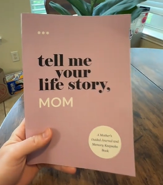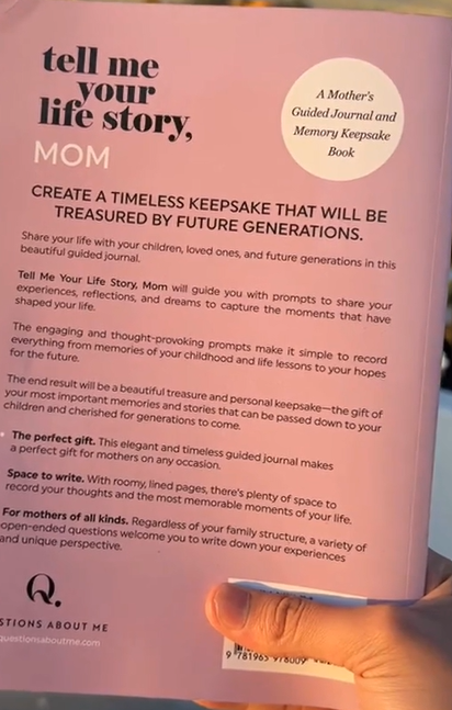 It’s a guided journal with thoughtful prompts, helping your mom reflect and share her life’s story in a meaningful way.